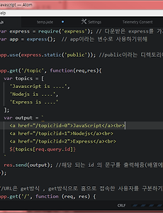 Javascript21 Javascript : nodejs Express 쿼리스트링 쿼리 스트링이란?URL을 통한 데이터정보 전달이라고 생각하면된다.예를 들면 http://a.com/topic?id=1 이라고 있을때 id =1을 쿼리 스트링이라고 한다.이것은 id의정보가 1라는 것을 나타낸다. 예제 위와 같이 코드를 작성한다. 각각의 뜻하는 것은 일단 topics라는 배열에 작성한 스트링을 넣어준다(각각의 쿼리스트링에 해당되는 정보를 보여주기위해서)그리고 output이라는 변수에다가 id즉 쿼리스트링에 해당되는 링크를 만들어준다.그리고나서 topics변수에 해당되는 스트링을 보여준다. 마지막으로 res(응답)에다가 output을 해주면 각각의 해당되는 링크를 보여줄것이고그 링크를 클릭했을때 해당 쿼리스트링이 찍히면서 글을 보여줄것이다. 위와같이 각각 쿼리링크(id =0,1,2)에 해당되.. 2017. 4. 20. Javascript : nodejs express 정적표현 정적표현이란? 쉽게 이야기하면 동적의 반대이다. 프로그래밍 적으로 만들어진 정보를 동적이라고 한다. 반대로 사람이 만들어 언제나 똑같이 나타내는것을 정적이라고 한다. 즉 이미지, CSS파일 JavaScript파일과 같은 정적 파일을 제공하려면 Express만의 방식을 사용해야한다. 방법 일단 expressjs.com 의 홈페이지에 보면 정적으로 나타내는 방법을 알려준다.위의 그림을 보면 express.static('public(폴더)')에서 public이라는 디렉토리를 정적으로 사용한다는 의미이다.따라서 디렉토리를 생성! 디렉토리는 그냥 우리가 만든 server_side_javascript디렉토리에 생성해준다.그리고 public 디렉토리안에 사진을 하나 넣는다. 위의 그림에서 3번째 코드를 보면 홈페이지.. 2017. 4. 20. Javascript : nodejs Express 이용 Express란? Express는 웹 및 모바일 애플리케이션을 위한 일련의 강력한 기능을 제공하는 간결하고 유연한 Node.js 웹 애플리케이션 프레임워크이다. 즉 nodejs에서 웹을 만들기위해 더 편하게 만들기위해 제공하는 소프트웨어라고 보면된다. Express설치 및 예제 expressjs.com으로 접속한다그럼 바로 인스톨하는 방법이 보이는대 저번에 배운대로 설치하면된다물론 설치전에 패키지를 지정해주는것이 필수! (NPM이라고 보면된다 ) 2017/04/18 - [Javascript] - Javascript : nodejs NPM 이용 윗글 참조 그럼 cmd 창을 띄워 디렉토리를 내가 만든 패키지 폴더로 이동시킨후에 다운 아톰에서 확인해보면 여러가지 폴더가 만들어진 것을 확인할수있다. 이로써 웹을.. 2017. 4. 19. Javascript : nodejs NPM 이용 NPM을 이용하기 기본적인 예제를 통해서 NPM을 알아보았다. 그럼 이번에는 npm을 통하여 다른사람의 모듈을 이용하는 방법을 알아보자. npm에서 underscore이라는 소프트웨어를 다운받아서 사용해보자. 검색해보면 따로 다운로드 하는방법이 없다. 위의 그림에보면 사이트가 보이는대 들어가보자. 밑에보면 install방법이 보인다 node.js용으로 복사 하지만 다운받기전에 내가 현재 다른사람의 패키지를 이용하기위해서는 나역시 패키지로 만들어야한다.패키지를 만들기위해서는 cmd화면에서 npm init을 치면 된다. 그럼 몇가지 절차가 나오는대 대충 뜻을보면 알수 있다. 그렇게 완성되면 패키지 파일이 하나 생성된다 그럼 이제 아까 복사해둔 underscore를 다운 그럼 아톰으로 돌아가보면 폴더가 생성된.. 2017. 4. 18. Javascript : nodejs NPM NPM이란? NPM(Nodejs Package Manager)라한다 NPM은 쉽게 말하면 핸드폰에서의 어플이라고 보면된다 핸드폰만으로는 새로운 기능을 사용하기 힘들다. 그래서 우리는 어플을 다운받아 다른 기능들을 사용하는대 편의성을 높인다. 이처럼 편의성을 높이기위한 것을 NPM이라고 보면된다. 간단한 예제 일단 사이트에 접속한다 ( npmjs.com) 상단에 예제로 사용할 소프트웨어를 검색 (uglifyjs 라는 소프트웨어)을 검색하면위 그림과 같이 다운로드 하는방법을 알려준다. cmd에 접속해서 복사한 것을 붙여넣기하면 다운이 시작 그럼 내가 미리 작성해놓은 코드를 uglifyjs를 통해 실행시키면 들여쓰기나 띄어쓰기가 제거된후 실행되는 사실을 알수 있다. 원래 코드의 원본 2017. 4. 18. Javascript : node.js 기본 웹 에플리케이션 간단한 웹 예제 기본적으로 예제를 하기전 알아야할 개념으로 클라이언트와 서버의 관계이다. 클라이언트(사용자) 서버( 데이터 제공자)로 나누어진다. 즉 사용자가 정보를 얻기위해 요청하는 곳이 서버이고 서버에 접속할때 보통 우리는 도메인을 사용한다. 도메인은 숫자로만 되어있는 (ex 215.512.885.112) IP를 사람이 쉽게 알아볼수 있도록 해주는 역할을한다. ( IP(컴퓨터언어) = 도메인 (사람언어) ) 포트는 서버에 접속하기 전에 들어갈수 있는 문이라고 생각하면된다. 현재 HTTP는 80번 포트를 사용중이다.즉 http로 접속하는 모든 것들은 80번 포트로 지정되어 있기때문에 생략이 가능하다.이정도 개념을 가지고 밑의 예제를 시작해보자 nodejs.org 홈페이지에 가보면 ABOUT에 기본적인 .. 2017. 4. 17. Javascript : node.js 실행 Node.js 실행node.js는 자바스크립트를 기본으로하는 서버측 언어라고 보면된다. 즉 자바스크립트를 기반으로 하기 때문에 쉽고 빠르다 라는 장점이있다. 또한 자바스크립트를 웹이라는 울타리에서 벗어나게 해주는 아주 중요한 역할을 하기 때문에 node.js를 공부해보자. 2017/04/17 - [Javascript] - Javascript : 